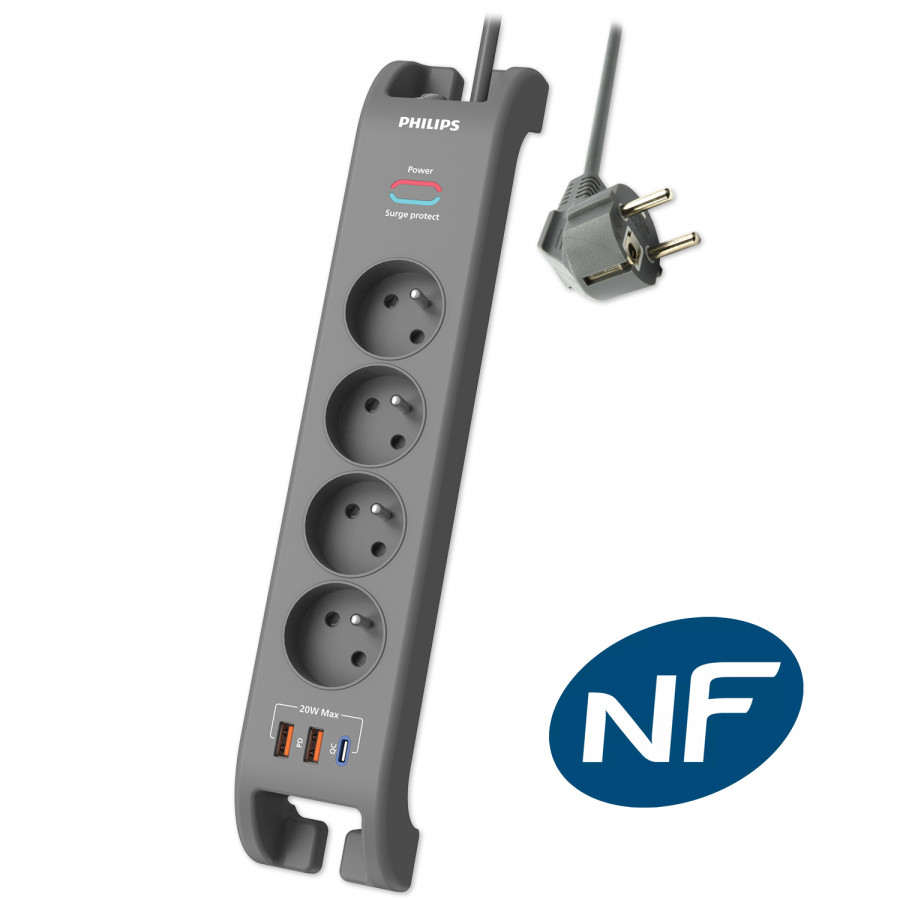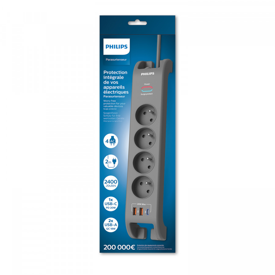 Philips - Multiprise parasurtenseur, 4 prises+Type-C+2xUSB-A-2m Gris