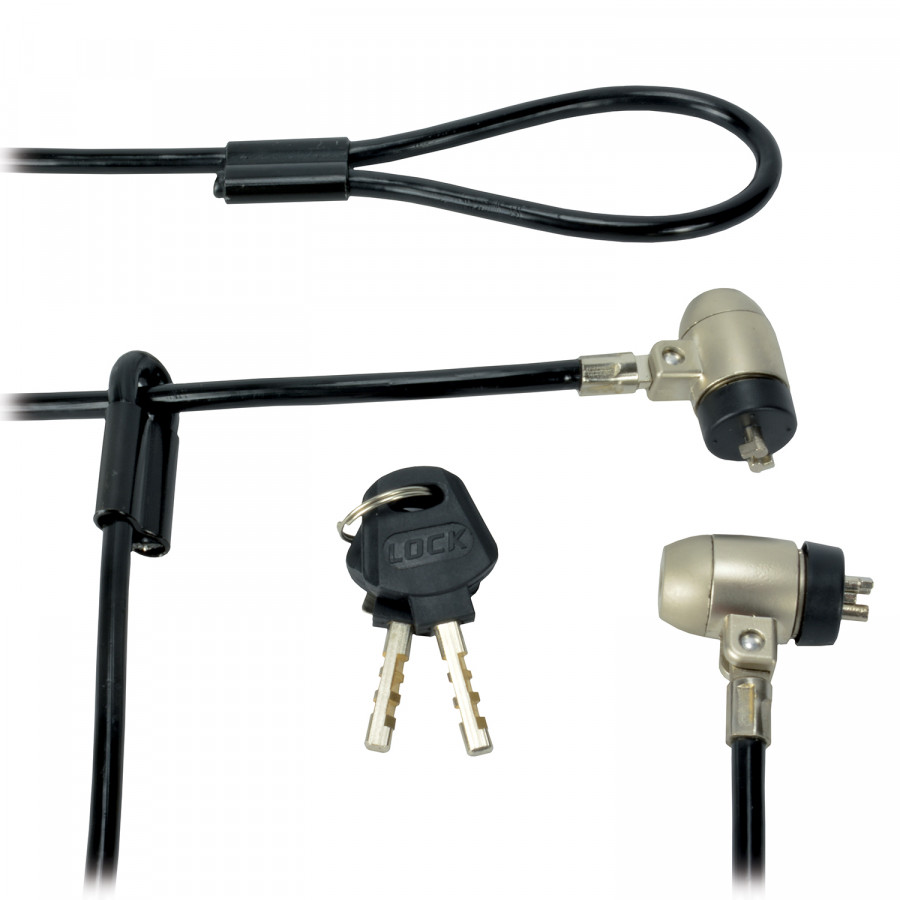 Antivol double à encoche pour les ordinateurs possédant une encoche de sécurité. Egalement utilisable avec les écrans plats ayant une encoche prévue à l’arrière. Il est constitué d'un câble de 1,80m sur lequel peut coulisser un autre câble de 0.4m afin de sécuriser deux matériels.