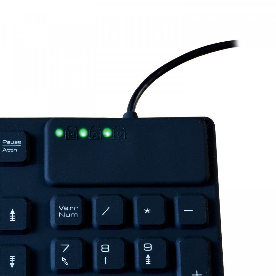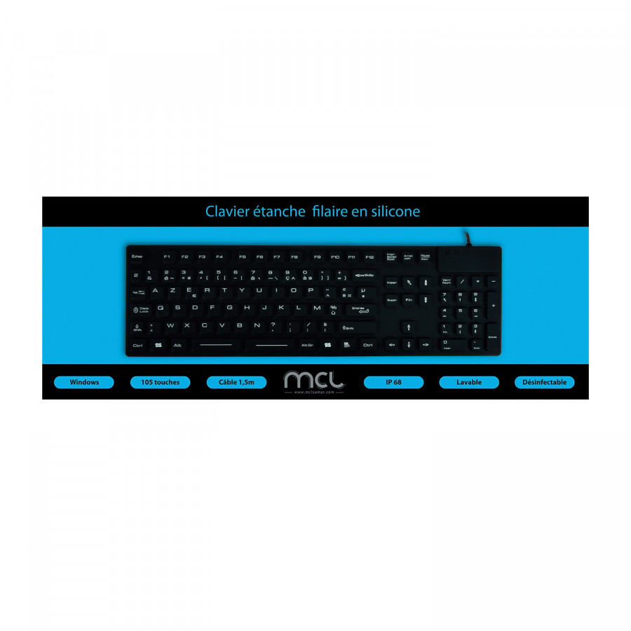 • Clavier Français AZERTY 105 touches_x000D_• Clavier étanche IP68_x000D_• Membrane silicone pour un nettoyage plus facile, résistante au gel hydroalcoolique, savon._x000D_• Plug and play_x000D_• Connexion : USB (Adaptateur PS2 fourni)_x000D_• Longueur du câble : 1,40m _x000D_• Compatible Windows_x000D_• Leds : On/Off, Verrou numérique, Majuscules, Arrêt défilement)_x000D_• Dimensions : 440 x 138 x 12mm