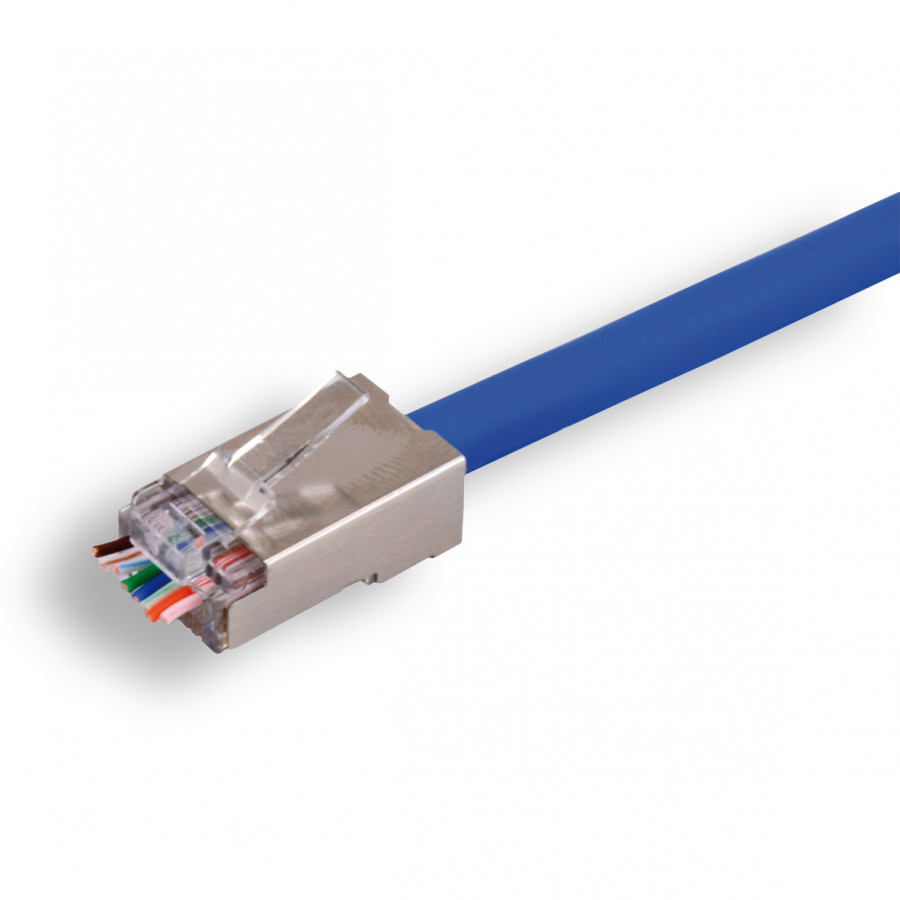 Ce connecteur RJ45 catégorie 6 a la particularité de ne pas avoir de terminaison. Laissez dépasser les conducteurs, la pince PS-RJ45U se chargera de les couper tout en les sertissant. De plus l'autre avantage est qu'il accepte aussi bien les câbles souples que les câbles rigides.