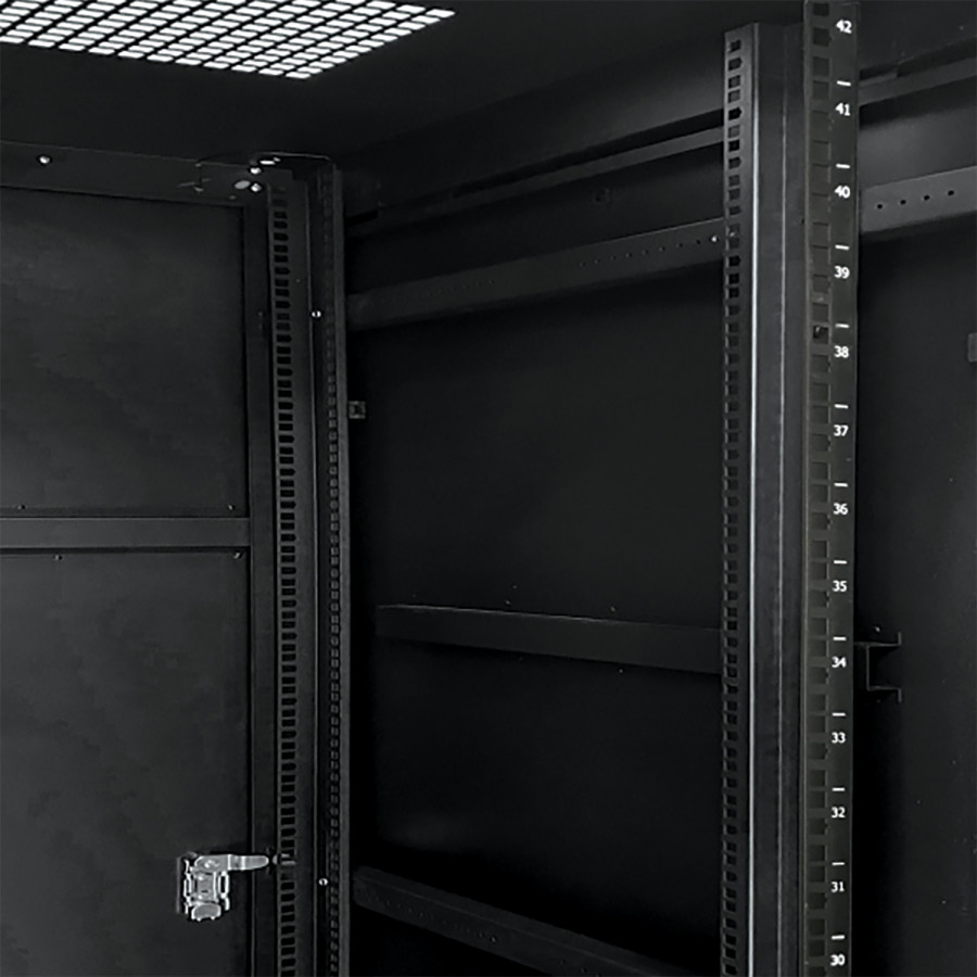 • Montants19” verticaux ajustables, 2 avant + 2 arrière, couleur noire, marquage des U en blanc