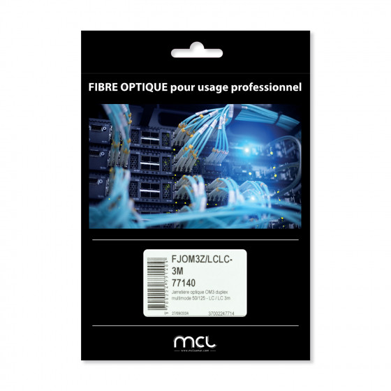Jarretière équipée d'une fibre optique OM3 50/125 microns à laser Giga Ethernet, jusqu'à 10 Gbits/s sur une longueur max. de 300m.